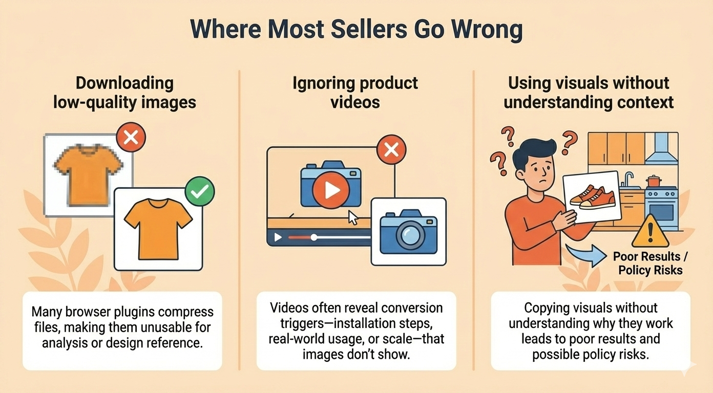 Videos often reveal conversion triggers—installation steps, real-world usage, or scale—that images don’t show. - Using visuals without understanding context