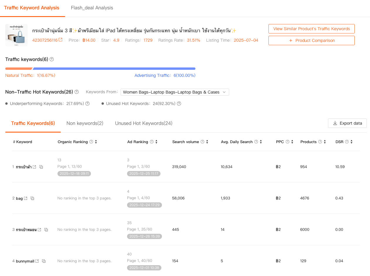 Traffic Analysis allows me to see traffic keywords tied to a specific product, including those that bring impressions but not clicks, as well as keywords driving consistent engagement. Just as importantly, it surfaces unused hot keywords—search terms with proven demand that competitors haven’t fully captured yet.
