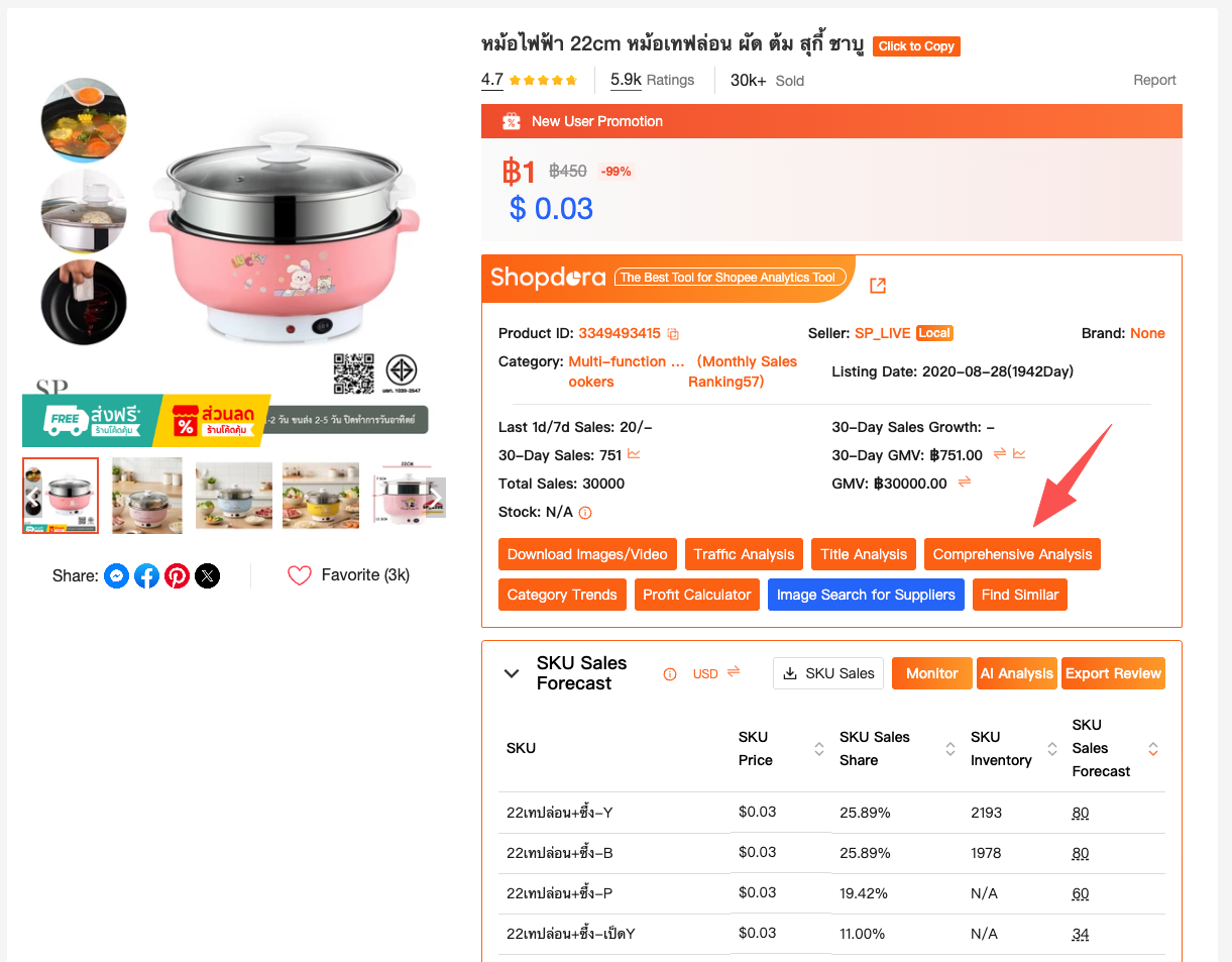 What appeals to me here—and what separates a modern Shopee analytic tool from old-school scrapers—is the workflow. You don't need to leave the Shopee page. When you are looking at a competitor’s product on the front end, you just hit "Comprehensive Analysis," and it overlays the product's entire life cycle right there on the screen.