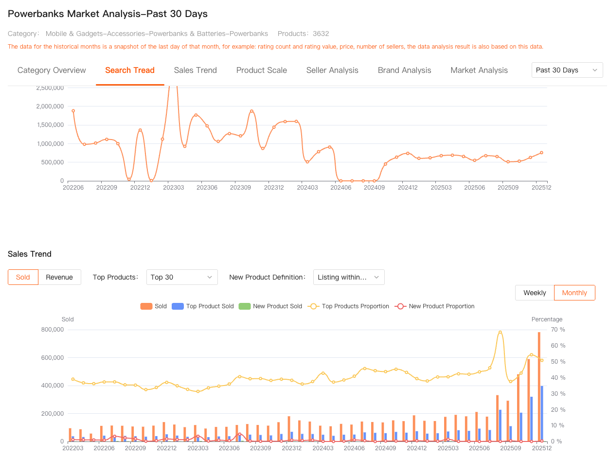 Comprehensive Analysis allows you to examine individual products within the context of the market. You’re not just seeing sales snapshots—you’re seeing trends, lifecycle signals, ranking movement, SKU structure, pricing behavior, and how a product performs over time rather than in a single moment.