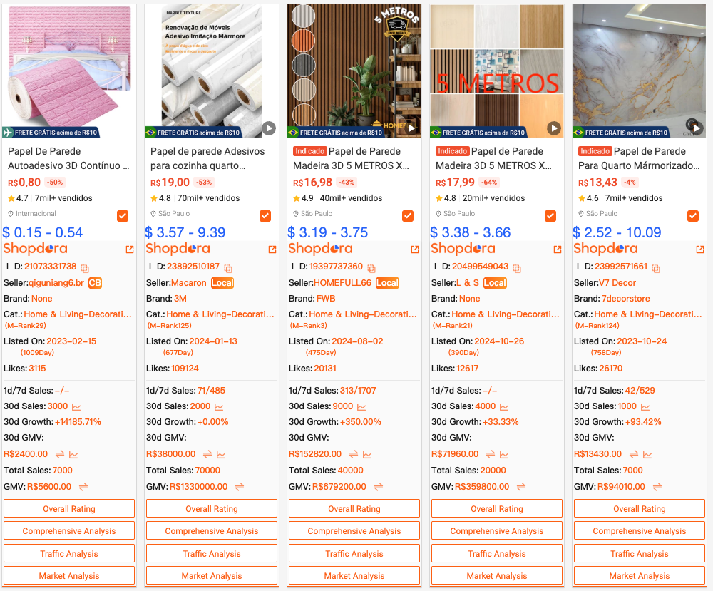 Home-related terms — wallpaper, organizer box, light fixture, living room rug, bedroom decoration — continue to dominate the Brazilian market, reflecting strong demand for affordable home upgrades and year-end organization.
