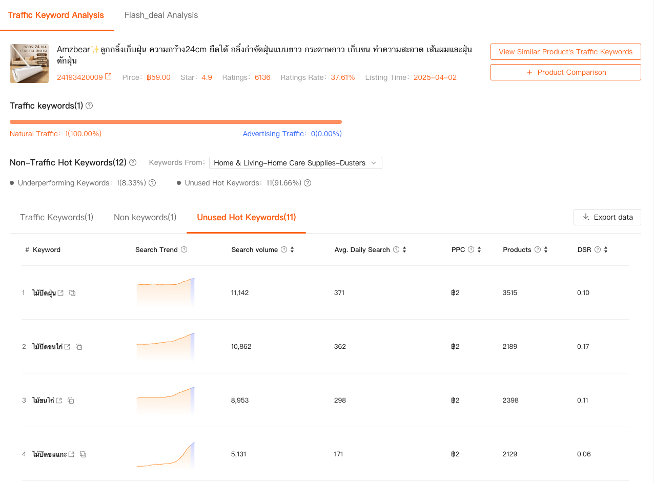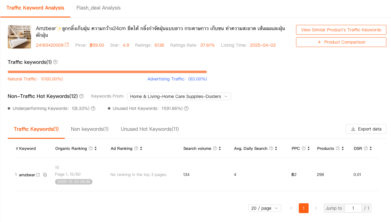 This is where Shopdora’s Traffic Keywords and Non-Traffic Hot Keywords become especially valuable for competitor analysis. Instead of only seeing keywords that already bring traffic, I can also see keywords that are trending in the market but haven’t fully converted into traffic yet.