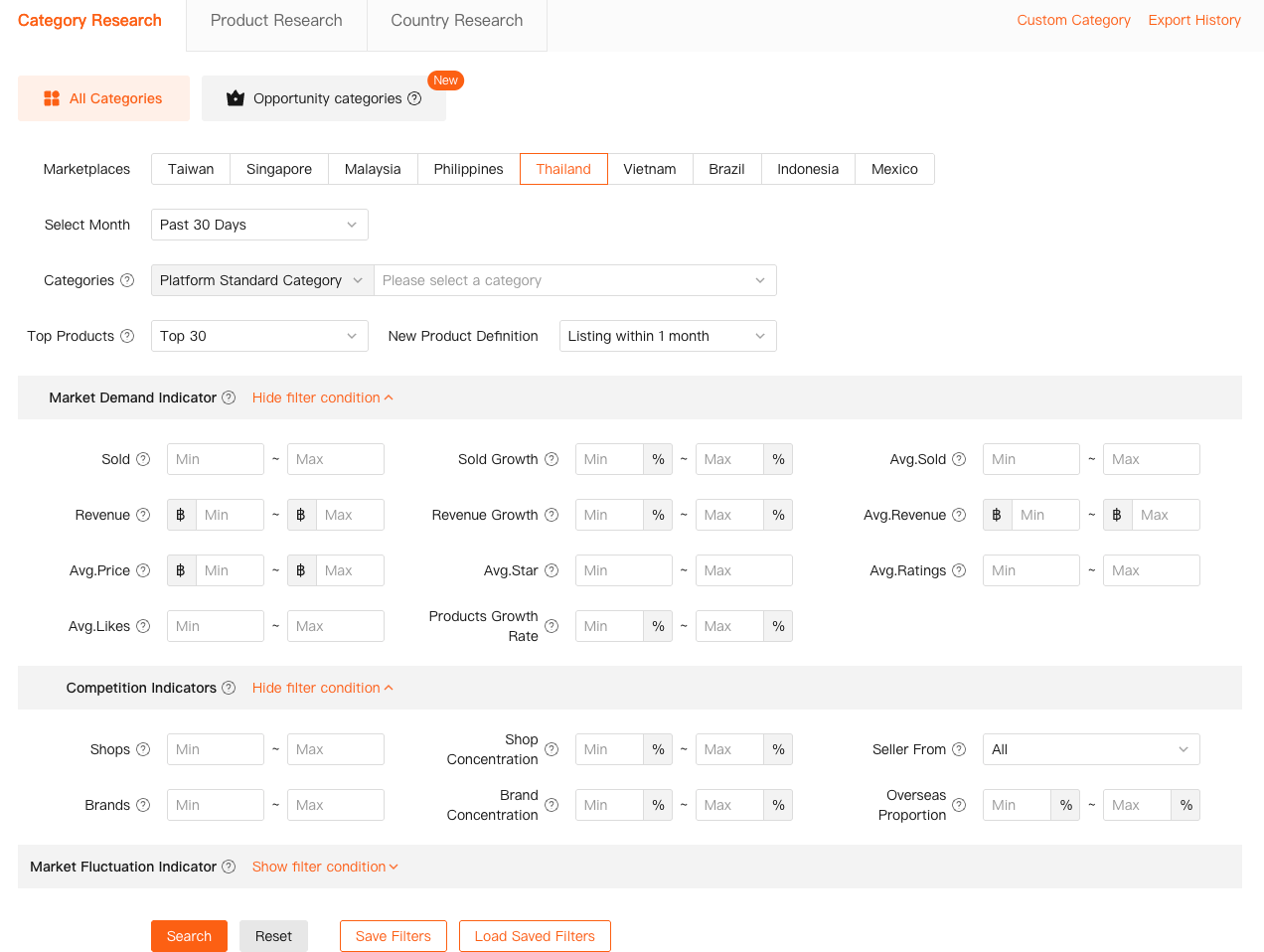 Category Research allowed me to filter categories by site, time range, and multiple indicators—market size, growth, competition structure, and the role of new products. Instead of relying on intuition or random browsing, I could systematically narrow down categories that matched my risk tolerance and resources.