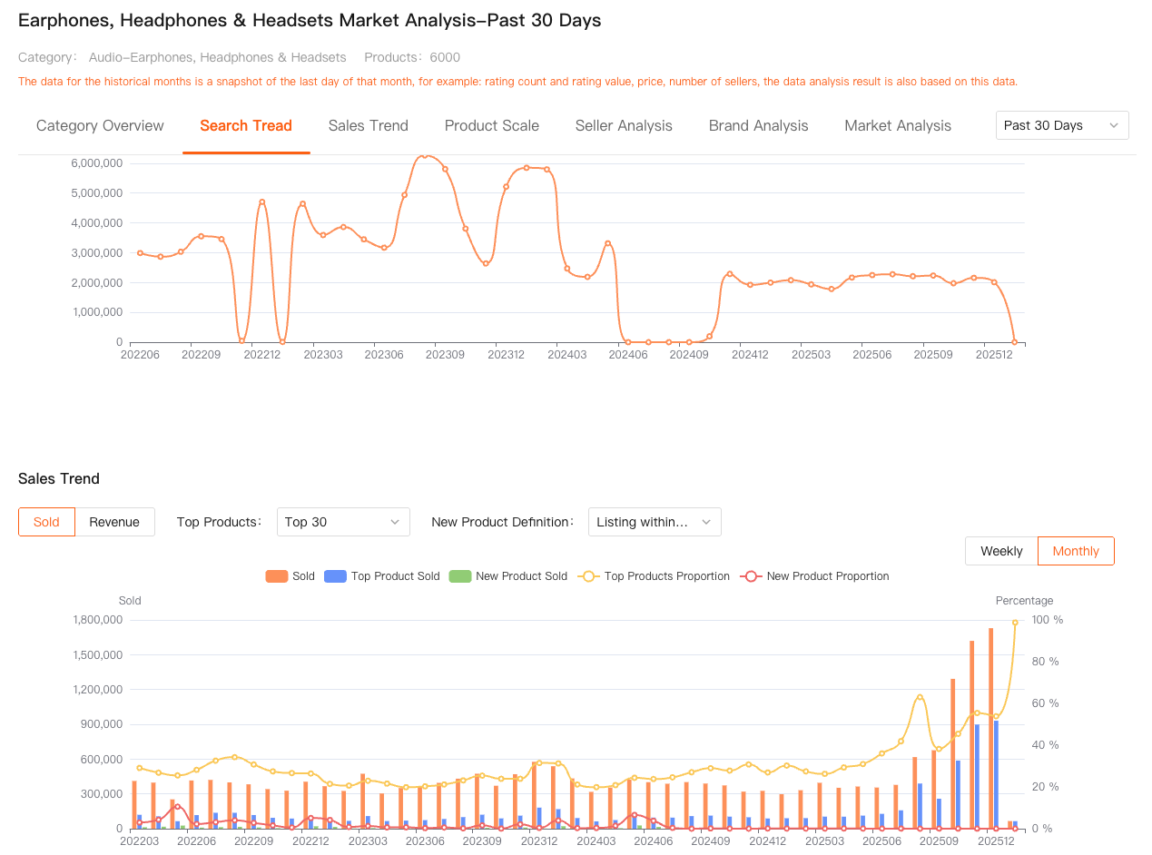 Instead of starting with my product, I started with the category. Market Analysis allowed me to see overall category trends—whether demand was growing or shrinking, how competitive the space was becoming, and how concentrated sales were among top sellers.