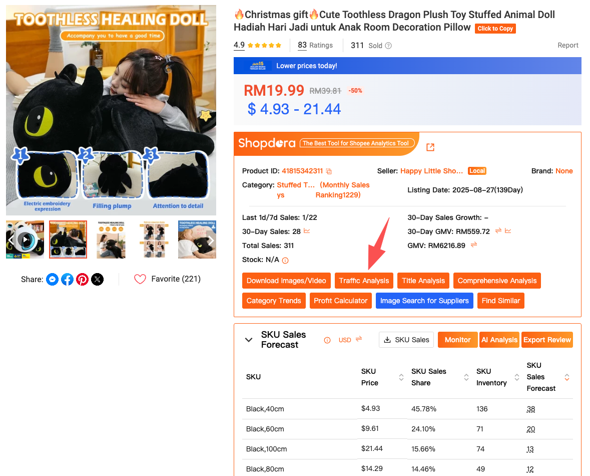 When you want to understand why a product or category is getting traffic, open Shopdora via the web dashboard and enter the product link or SKU into Traffic Analysis. This feature is available directly on the Shopdora platform and, for faster checks, can also be triggered via the Shopdora browser plugin while browsing Shopee product pages.