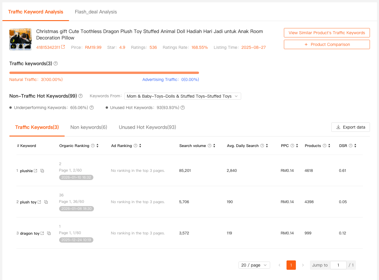 I remember reviewing a competitor’s product that ranked consistently higher than mine, even though our prices and reviews were similar. Through Shopdora’s Traffic Analysis, I discovered they were capturing organic traffic from a group of keywords I had never optimized for — keywords that didn’t appear clearly in Seller Center at all.