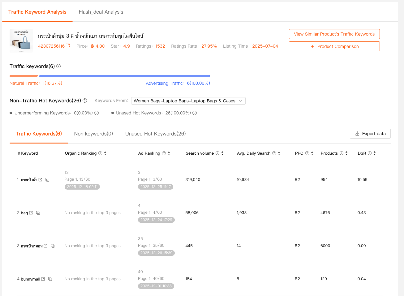 Using Shopdora’s Traffic Analysis and keyword-related data, you can see which keywords are actually driving traffic to competing products, which keywords are trending up or down, and which high-demand keywords aren’t fully utilized yet.