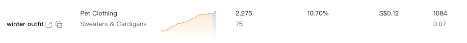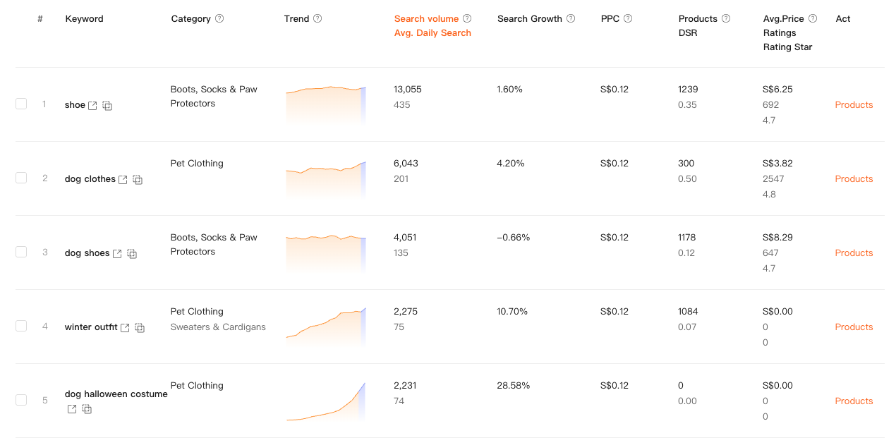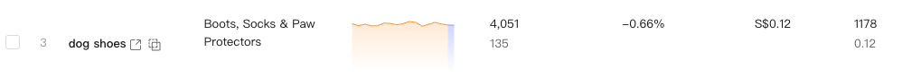 - “Dog shoes” has 4051 searches — high exposure + moderate competition(DSR 0.12,PPC S$0.12).