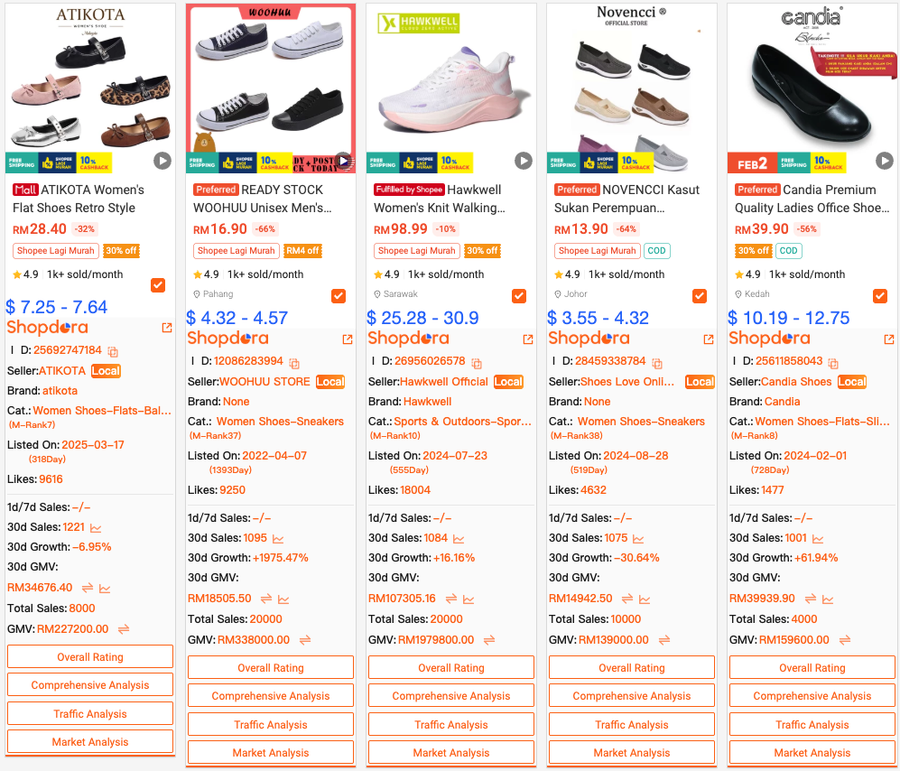 Keywords like heels, kasut lelaki, and kasut perempuan indicate consistent demand across both men’s and women’s footwear segments.