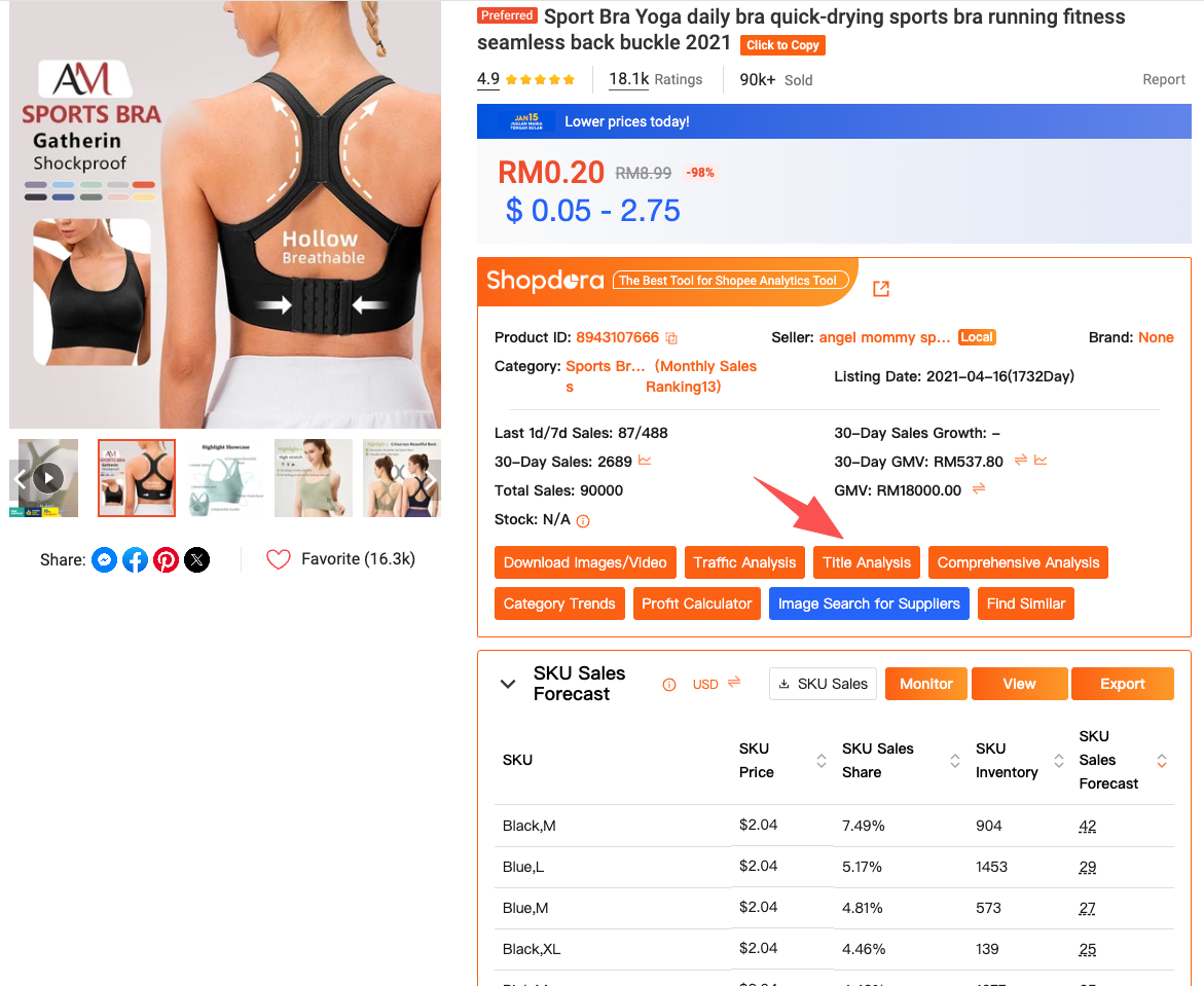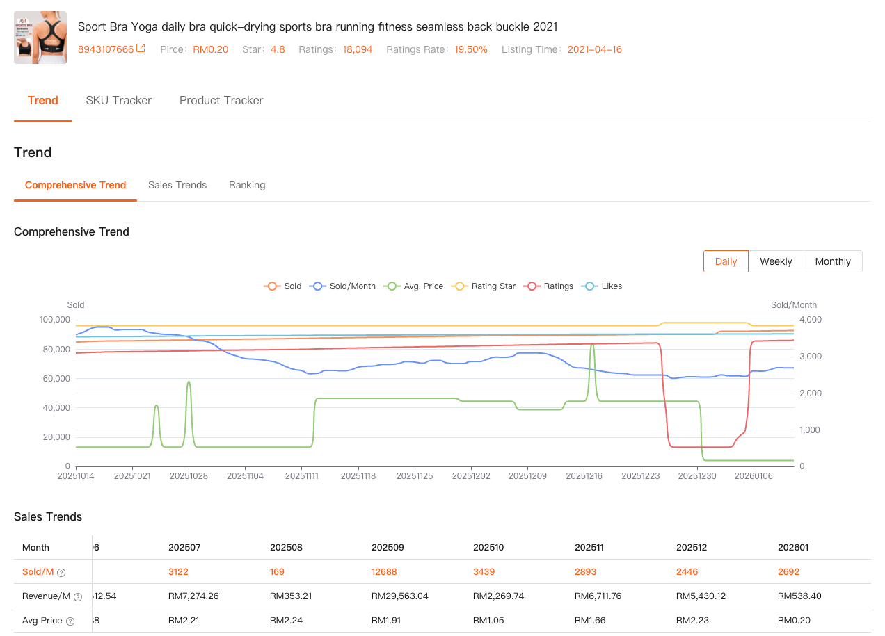 When I’m on a competitor’s Shopee product page, I use the Shopdora browser plugin (installed directly from the Chrome Web Store). Once activated, I can open Comprehensive Analysis for that product and see historical sales trends, revenue movement, and ranking changes over time.
