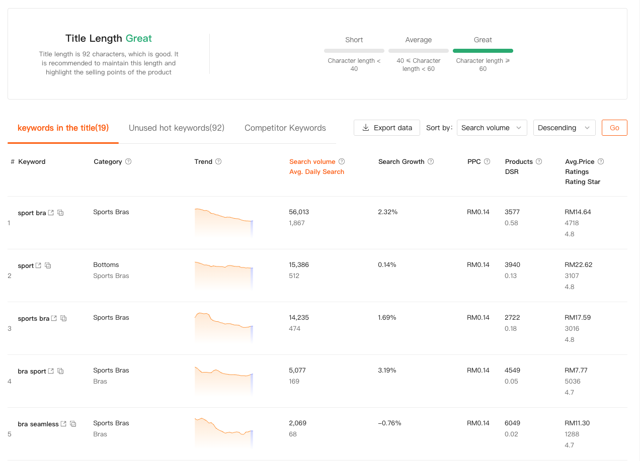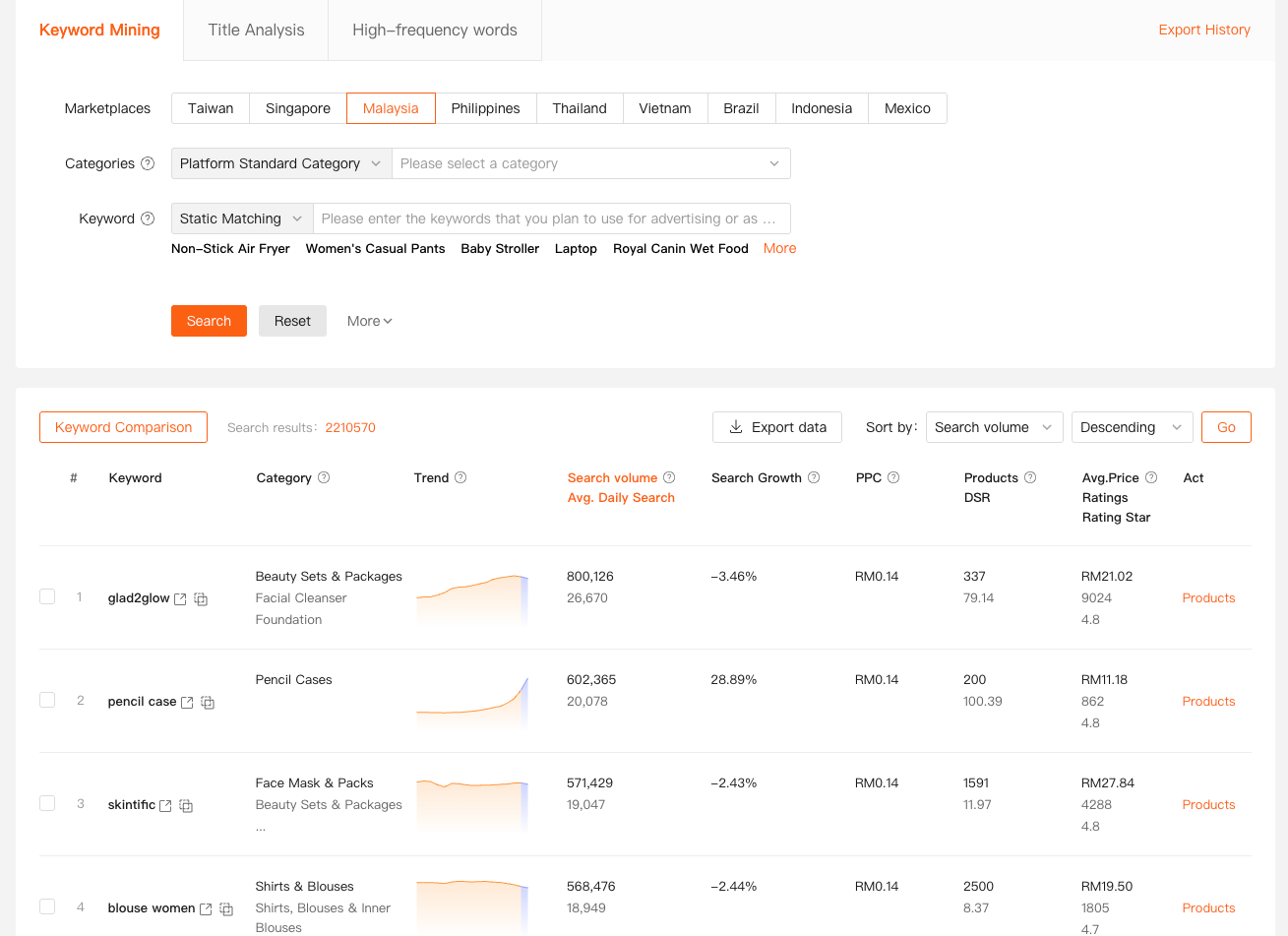 Inside Shopdora’s Keywords Mining, I can analyze real platform-level keyword data that Shopee itself doesn’t fully disclose in the seller backend. I can filter keywords by site and category, see search volume trends, growth rate, PPC competitiveness, and how many products are already competing for that keyword.