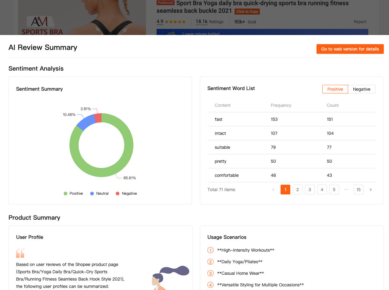 Using Shopdora’s AI Review Analysis, I analyze thousands of customer reviews from competing products. Instead of manually reading reviews one by one, the tool summarizes recurring complaints, praised features, and unmet expectations.