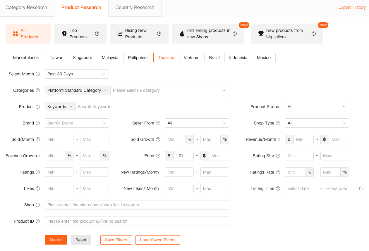 This is where Product Research comes in. Accessed via the Shopdora website, it allows filtering across marketplaces using concrete metrics: sales volume, growth rate, revenue, price range, ratings, and listing age.