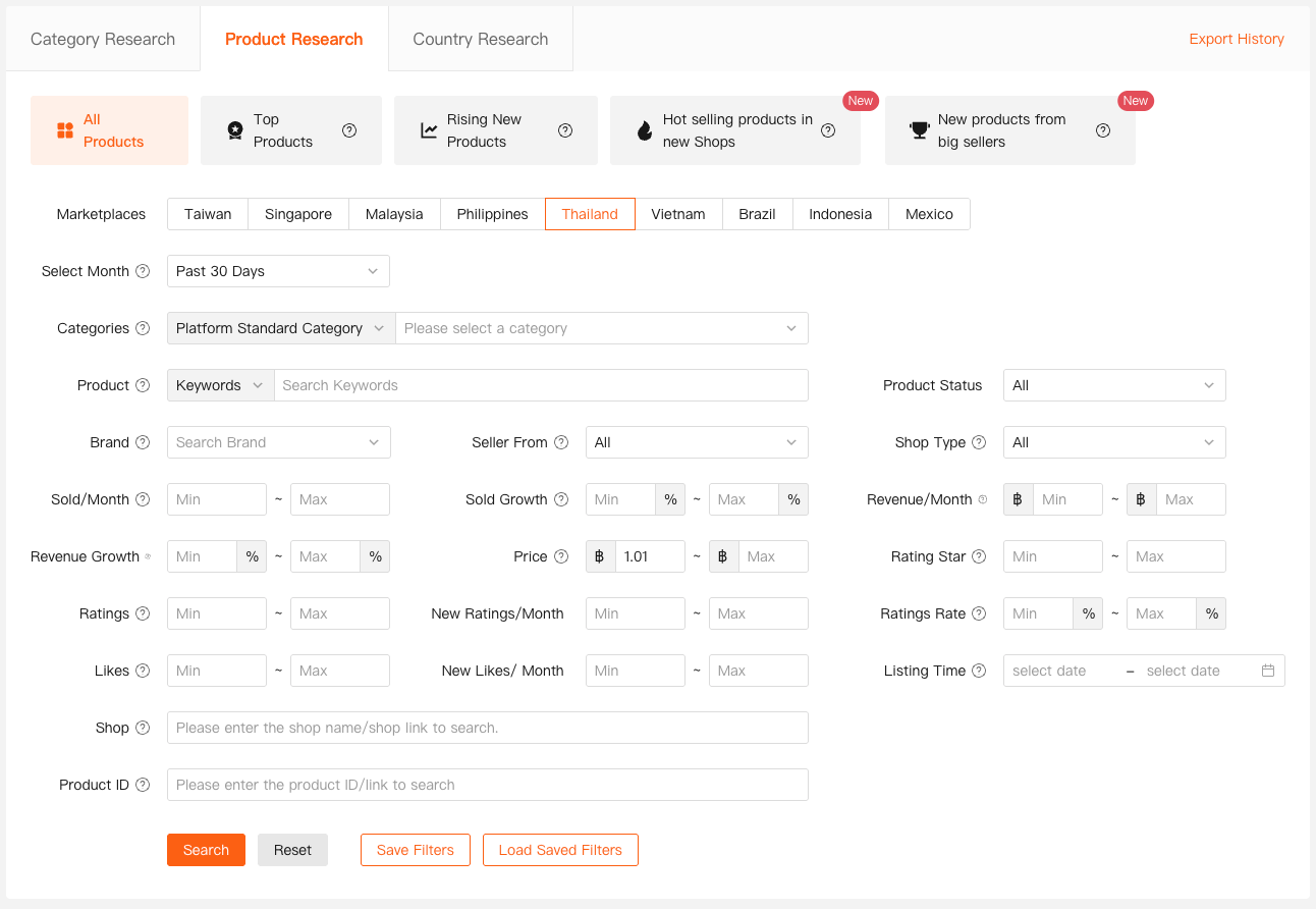 - Filter products by site, category, price range, sales volume, growth rate