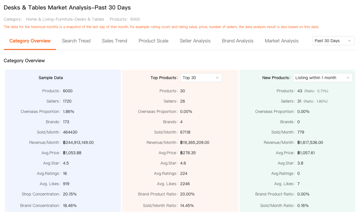 Shopdora’s Category Research feature helped me shift my thinking upstream. Instead of guessing based on search results or gut feeling, I could evaluate entire categories before committing resources. Category Research lets you filter by site, category, and time range, then shows you high-level indicators like total sales, growth rate, product count, brand concentration, and the share of new products.