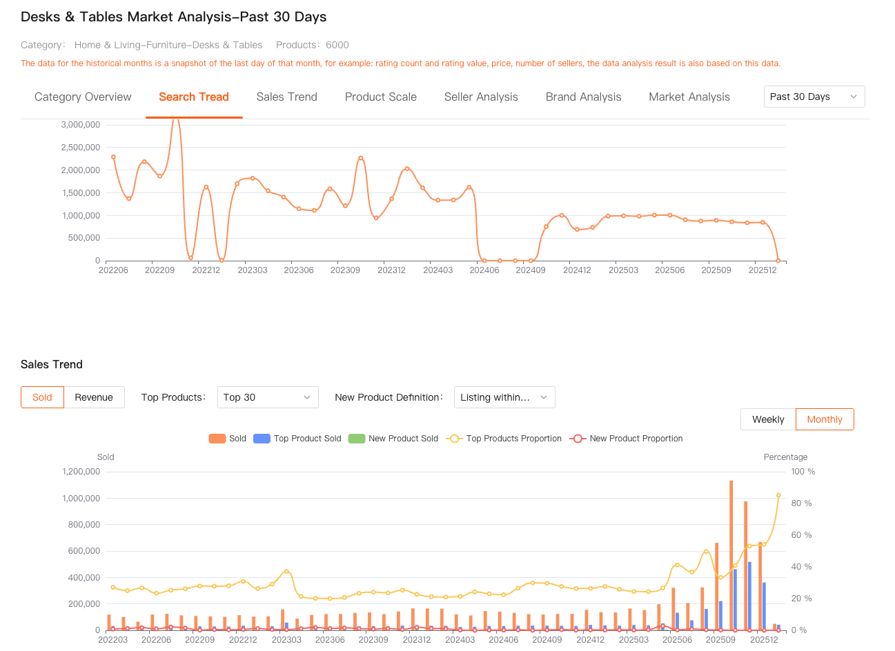What stood out immediately was how different reality looked when viewed from above. Market Analysis doesn’t focus on individual shops—it shows how an entire category is behaving over time. You can see whether overall sales are growing, flat, or declining, how concentrated the category is, and whether a few top products are dominating most of the demand.