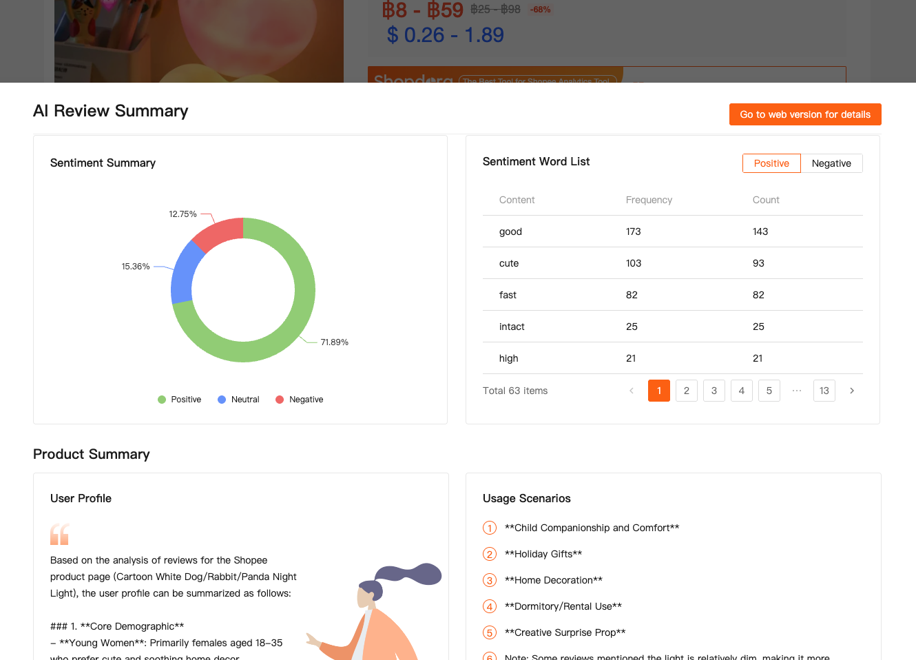 Right on the Shopee product page, the extension analyzes reviews and surfaces: