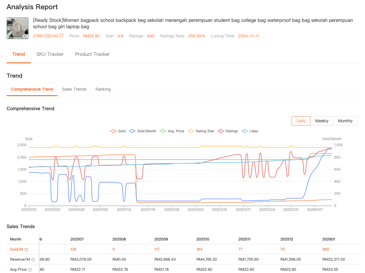 Saya tidak asal ambil video. Biasanya, sebelum mengunduh, saya cek dulu performa produknya lewat Analisis komprehensif yang bisa diakses dari plugin yang sama. Dari situ saya lihat tren penjualan dan pergerakan performa produk tersebut.