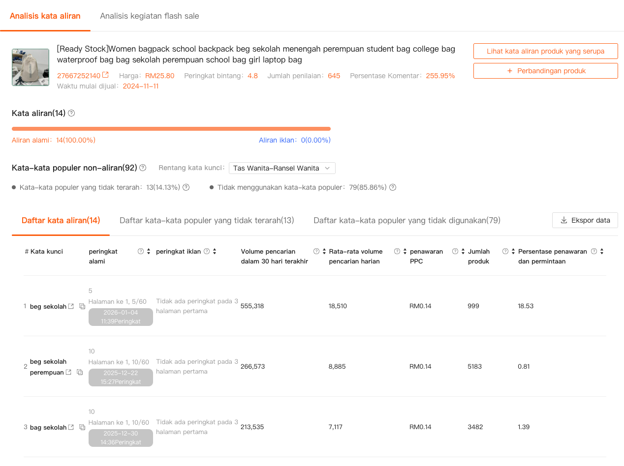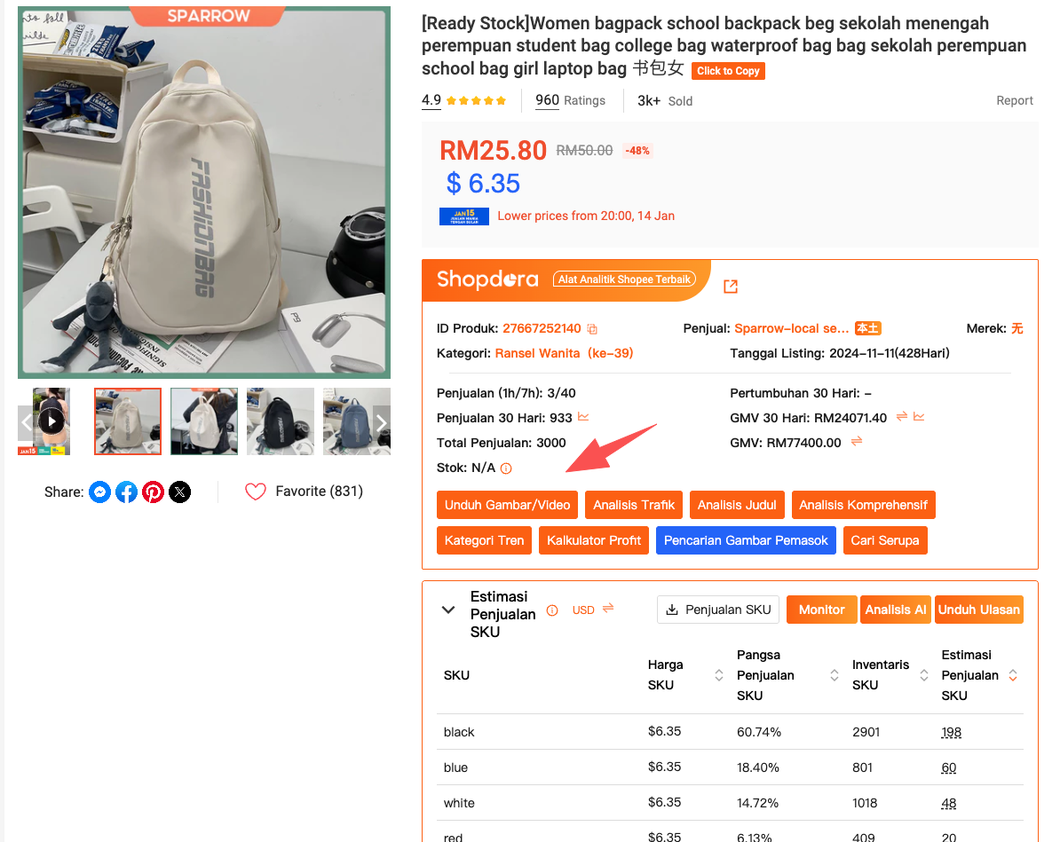 Saya temukan produk kompetitor yang stabil melalui Analisis komprehensif, lalu unduh konten visualnya menggunakan Unduh Gambar/Video lewat plugin. Setelah itu, saya analisis bagaimana trafik produk tersebut terbentuk lewat Analisis Trafik.