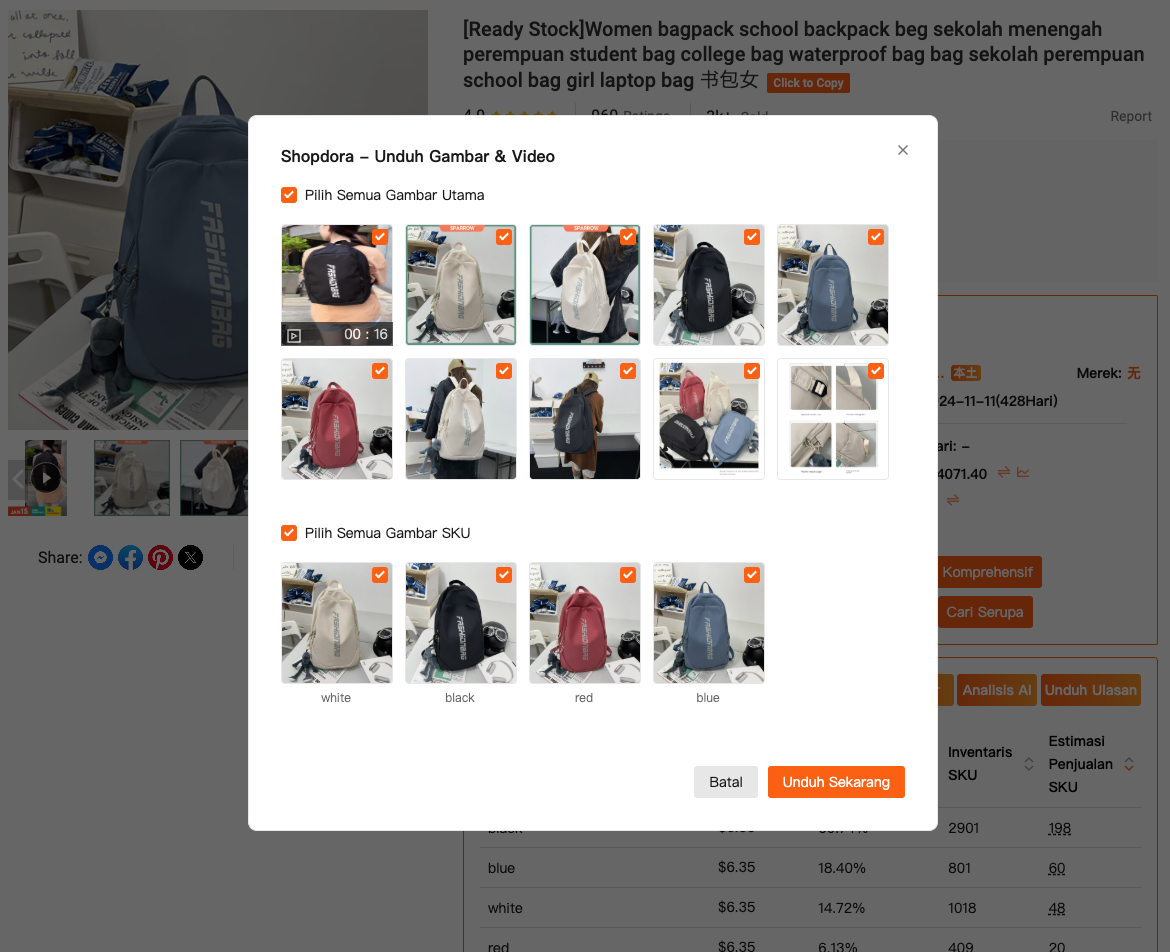 Saat saya membuka halaman produk kompetitor di Shopee, saya cukup mengaktifkan Shopdora browser plugin (Chrome Plugin Download). Setelah plugin aktif, saya bisa langsung mengunduh gambar dan video produk dalam kualitas asli, tanpa watermark, hanya dengan satu klik.
