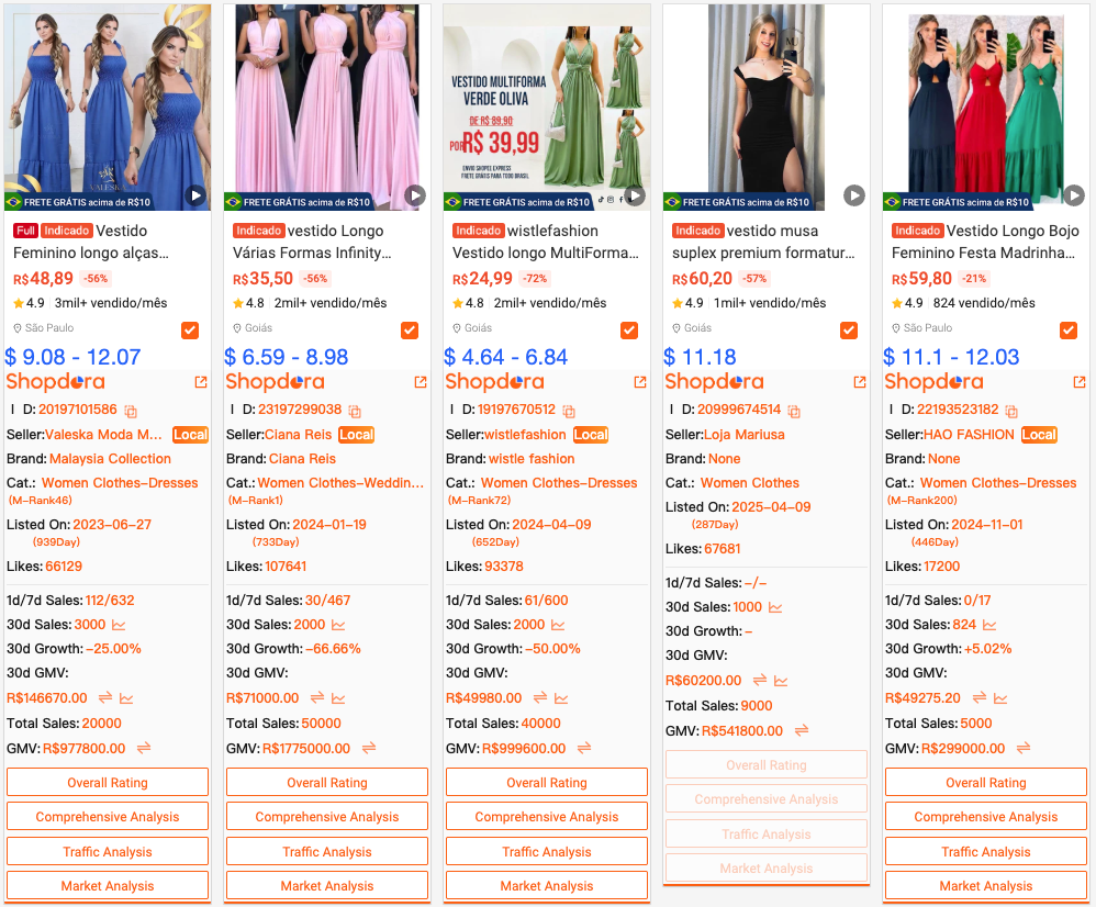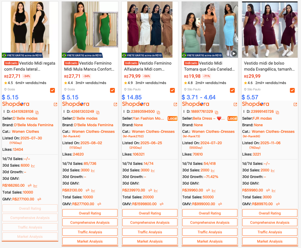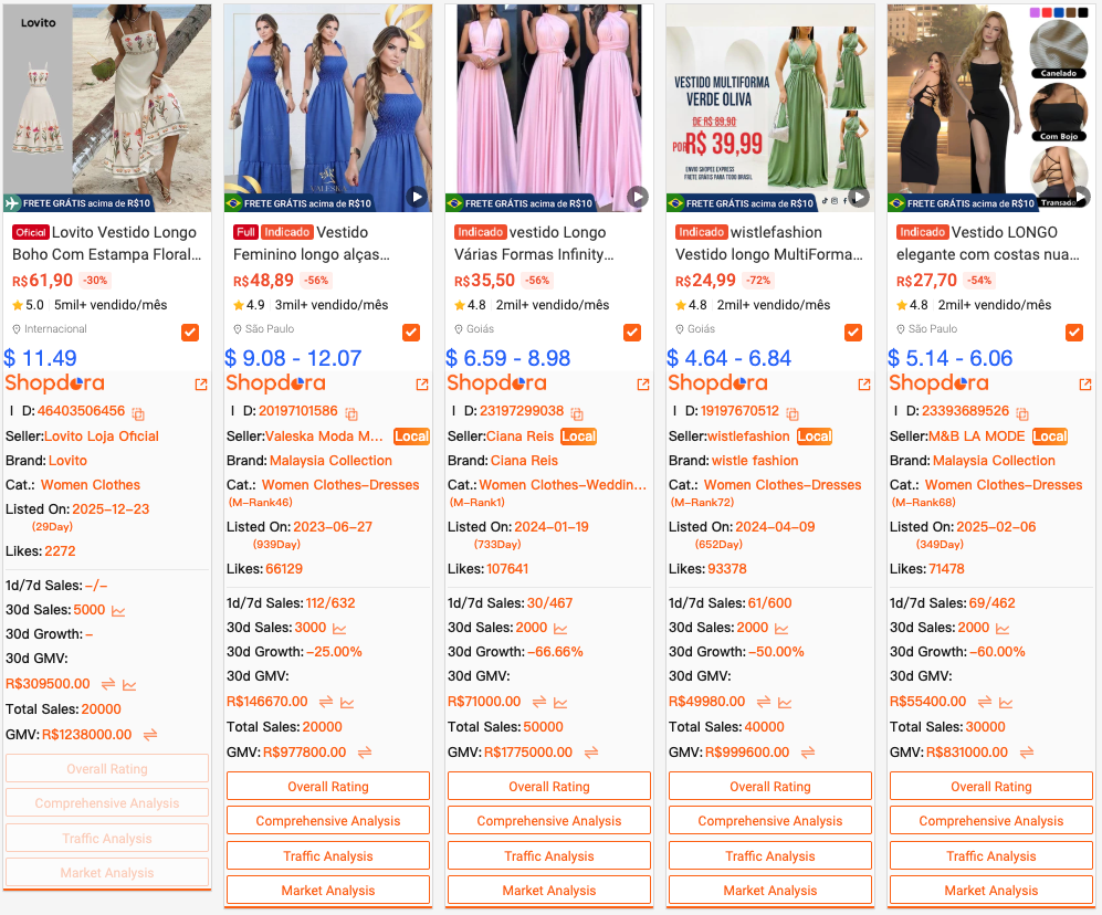 Beberapa keyword seperti vestido de festa, vestido longo, dan vestido midi menunjukkan tingginya minat terhadap gaun wanita untuk acara formal maupun kasual.