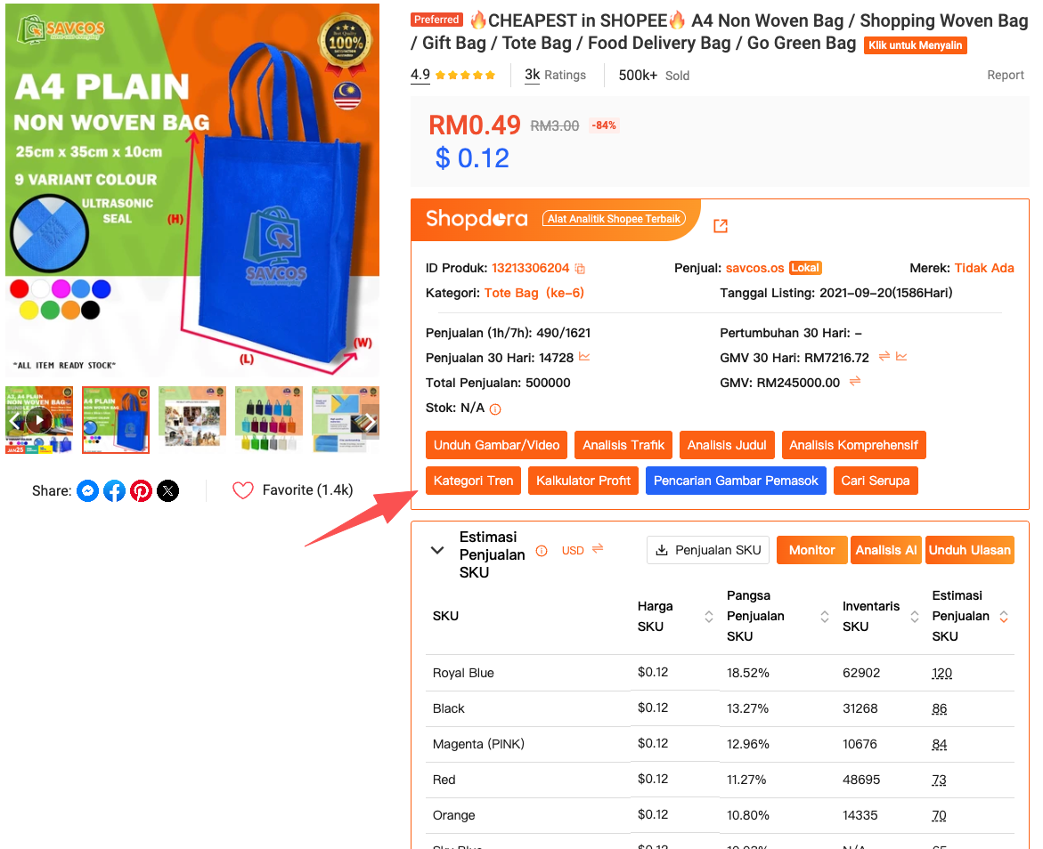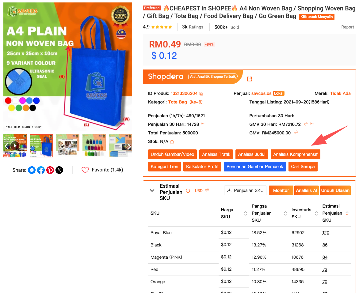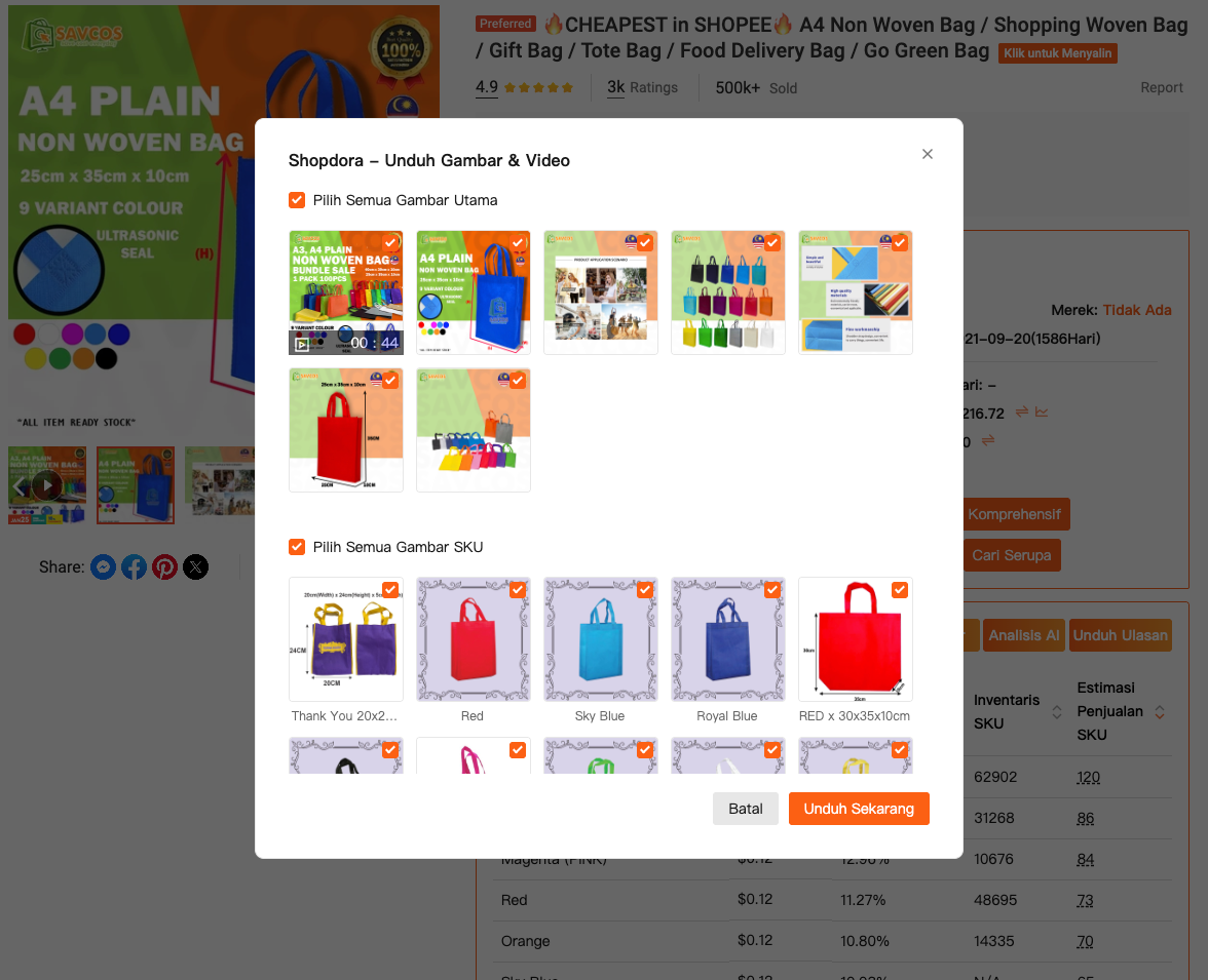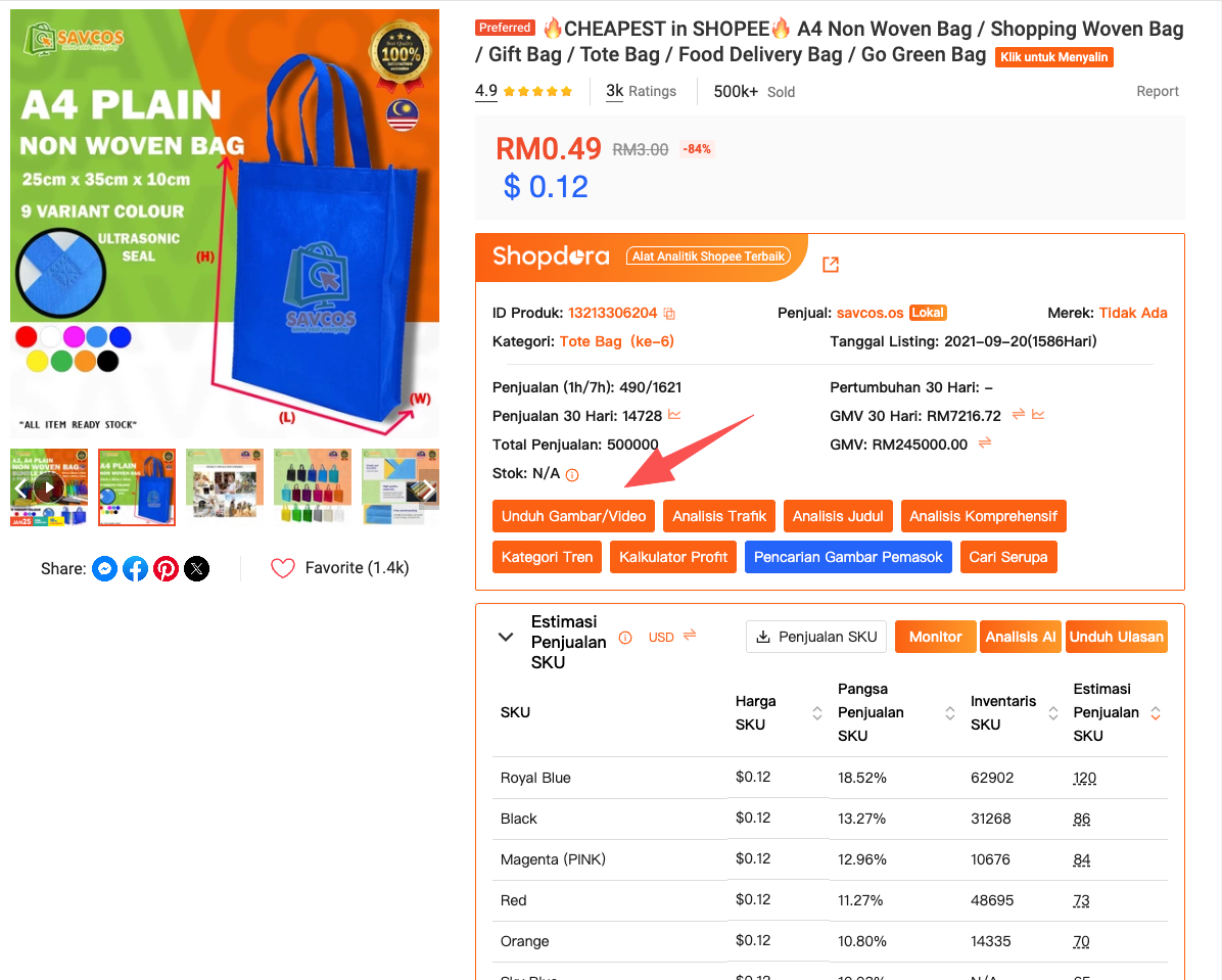 Saat ini, alur kerja saya sederhana. Saya mengunduh gambar dan video menggunakan alat Shopdora setiap kali saya mengidentifikasi pesaing yang layak dipelajari. Saya tidak menganalisisnya segera. Sebaliknya, saya pertama-tama mengecek tren pasar, performa produk, dan distribusi SKU menggunakan fitur analisis Shopdora.