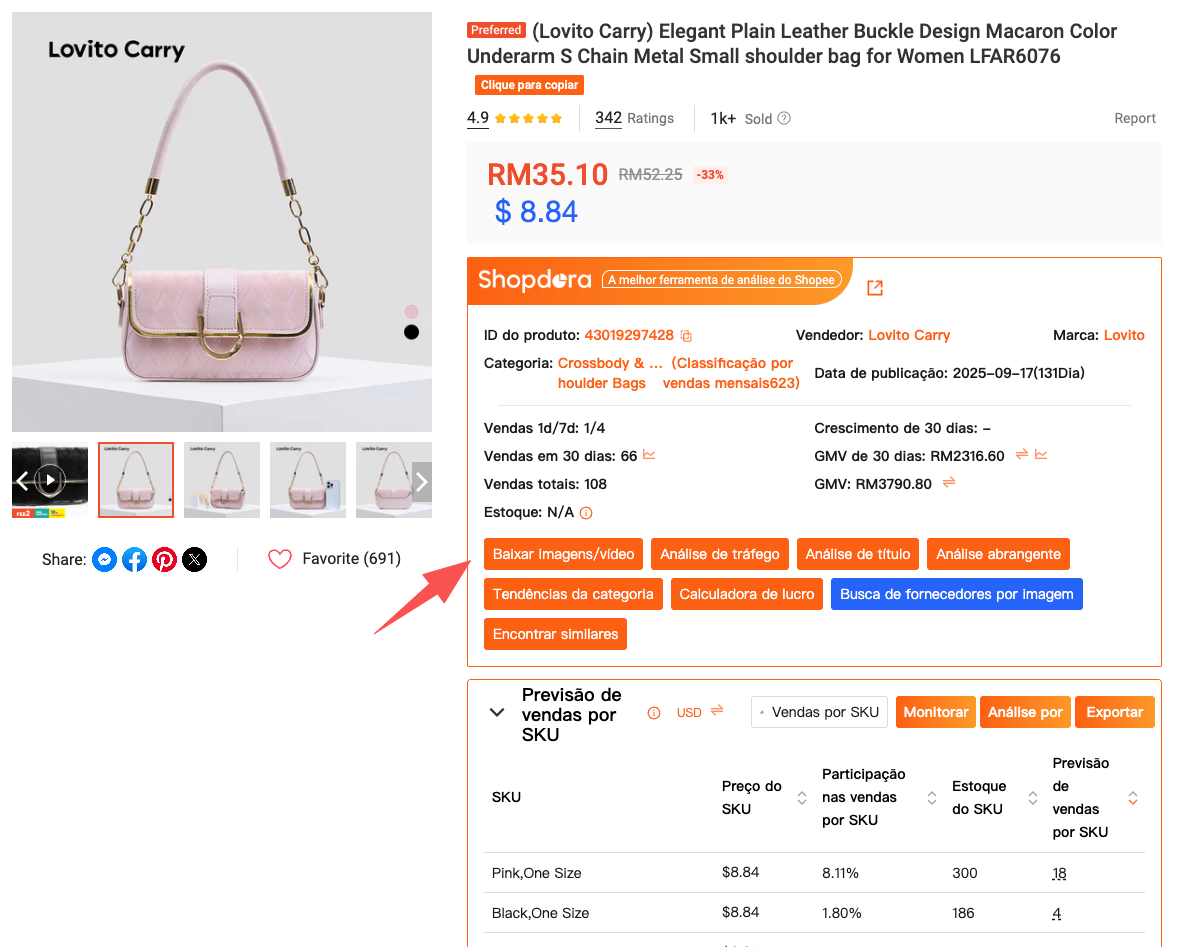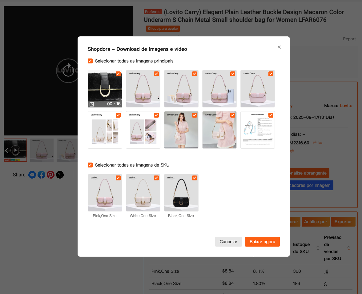 O recurso Download Image / Video da Shopdora está integrado diretamente ao plugin de navegador. Depois de instalar o plugin pelo site oficial da Shopdora e fazer login, ele é ativado automaticamente quando você navega por páginas de produtos da Shopee.